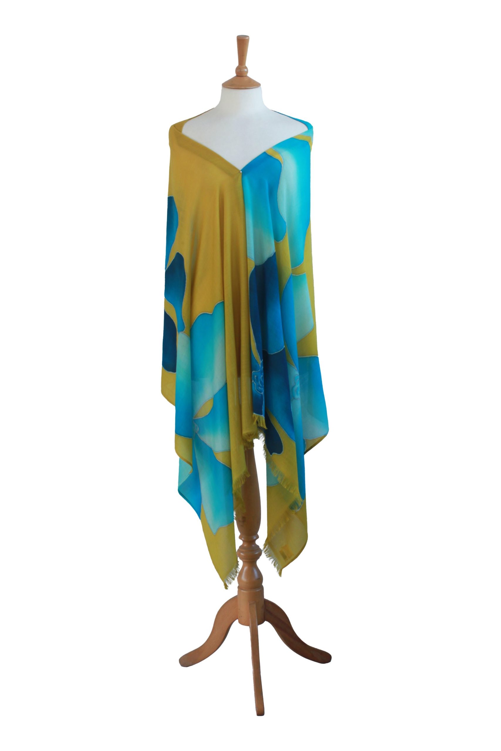 Incredibly soft and stunning Flax Flower handpainted in vibrant shades of Turquoise and Blue on Acid Yellow background.